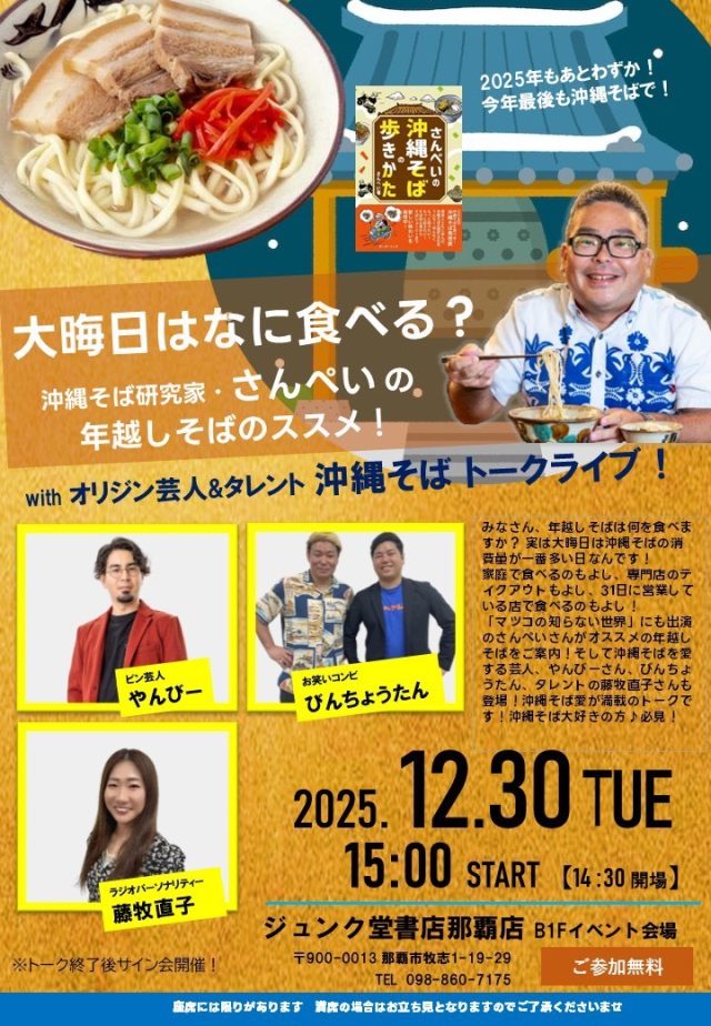 お知らせ origincorp 《12月30日(火)》沖縄そばトークライブ ▽トークライブ情報▽ 【日付】2025年12月30日(火) 【時間】開場/14:30 開演/15:00 【場所】ジュンク堂書店那覇店 B1F 【料金】無料 ポスト シェア はてブ 送る Pocket feedly